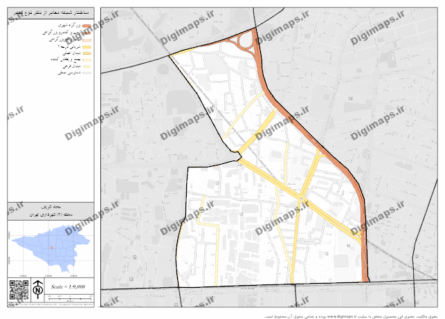 نقشه ساختار شبکه معابر محله شریف با فرمت PNG با کیفیت تصویر 300 dpi براساس استاندارد 14147 سازمان ملی استاندارد ایران تهیه شده است. مبنای محاسبه مقیاس در محصول ارائه شده ابعاد کاغذ چاپی و سیستم مختصات تصویر UTM (zone 39) میباشد.