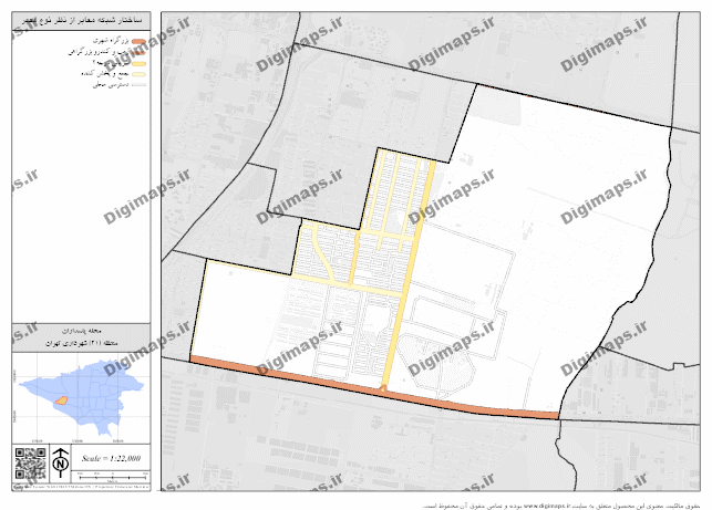 نقشه ساختار شبکه معابر محله پاسداران با فرمت PNG با کیفیت تصویر 300 dpi براساس استاندارد 14147 سازمان ملی استاندارد ایران تهیه شده است. مبنای محاسبه مقیاس در محصول ارائه شده ابعاد کاغذ چاپی و سیستم مختصات تصویر UTM (zone 39) میباشد.