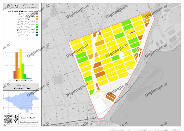این محصول شامل فایل دانلودی نقشه مقایسهای ترکیب مساحتی زیربنای واحدهای مسکونی محله حافظیه با فرمت PNG میباشد.مرکز آمار ایران، مساحت زیربنای کاربری مسکونی را به صورت گروهبندی مساحتی ارائه و تعداد واحدهای مسکونی در آن گروه بندی را محاسبه می کند. این گروهبندی شامل تعداد واحدهای مسکونی کمتر از 51 متر، بین 51 تا 75، بین 76 تا 80، بین 81 تا 100، بین 101 تا 150، بین 151 تا 200، بین 201 تا 300، بین 301 تا 500 و بیشتر از 500 میباشد. در محله حافظیه بیشترین فراوانی واحدهای مسکونی از نظر مساحت متعلق به دسته مساحت100 تا 81 مترمربع با 3379 واحد مسکونی است.