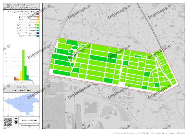 این محصول شامل فایل دانلودی نقشه مقایسهای ترکیب مساحتی زیربنای واحدهای مسکونی محله داوودیه با فرمت PNG میباشد.مرکز آمار ایران، مساحت زیربنای کاربری مسکونی را به صورت گروهبندی مساحتی ارائه و تعداد واحدهای مسکونی در آن گروه بندی را محاسبه می کند. این گروهبندی شامل تعداد واحدهای مسکونی کمتر از 51 متر، بین 51 تا 75، بین 76 تا 80، بین 81 تا 100، بین 101 تا 150، بین 151 تا 200، بین 201 تا 300، بین 301 تا 500 و بیشتر از 500 میباشد. در محله داوودیه بیشترین فراوانی واحدهای مسکونی از نظر مساحت متعلق به دسته مساحت 150 تا 101 مترمربع با 3977 واحد مسکونی است.