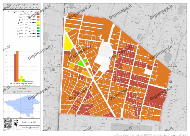 نقشه مقایسه مساحت زیربنای مسکونی بلوکهای آماری محله طیب با فرمت PNG با کیفیت تصویر 300 dpi براساس داده های مرکز آمار ایران در سال 1395 تهیه شده است. مبنای محاسبه مقیاس در محصول ارائه شده ابعاد کاغذ چاپی و سیستم مختصات تصویر UTM (zone 39) میباشد.