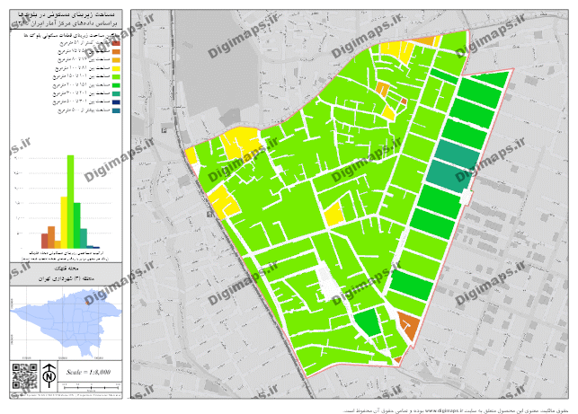 این محصول شامل فایل دانلودی نقشه مقایسهای ترکیب مساحتی زیربنای واحدهای مسکونی محله قلهک با فرمت PNG میباشد.مرکز آمار ایران، مساحت زیربنای کاربری مسکونی را به صورت گروهبندی مساحتی ارائه و تعداد واحدهای مسکونی در آن گروه بندی را محاسبه می کند. این گروهبندی شامل تعداد واحدهای مسکونی کمتر از 51 متر، بین 51 تا 75، بین 76 تا 80، بین 81 تا 100، بین 101 تا 150، بین 151 تا 200، بین 201 تا 300، بین 301 تا 500 و بیشتر از 500 میباشد. در محله قلهک بیشترین فراوانی واحدهای مسکونی از نظر مساحت متعلق به دسته مساحت 150 تا 101 مترمربع با 3101 واحد مسکونی است.