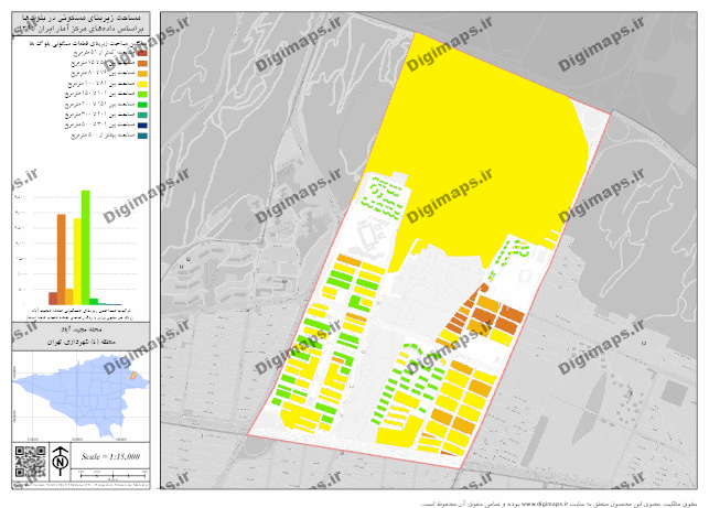 این محصول شامل فایل دانلودی نقشه مقایسهای ترکیب مساحتی زیربنای واحدهای مسکونی محله مجید آباد با فرمت PNG میباشد.مرکز آمار ایران، مساحت زیربنای کاربری مسکونی را به صورت گروهبندی مساحتی ارائه و تعداد واحدهای مسکونی در آن گروه بندی را محاسبه می کند. این گروهبندی شامل تعداد واحدهای مسکونی کمتر از 51 متر، بین 51 تا 75، بین 76 تا 80، بین 81 تا 100، بین 101 تا 150، بین 151 تا 200، بین 201 تا 300، بین 301 تا 500 و بیشتر از 500 میباشد. در محله مجید آباد بیشترین فراوانی واحدهای مسکونی از نظر مساحت متعلق به دسته مساحت 150 تا 101 مترمربع با 3720 واحد مسکونی است.