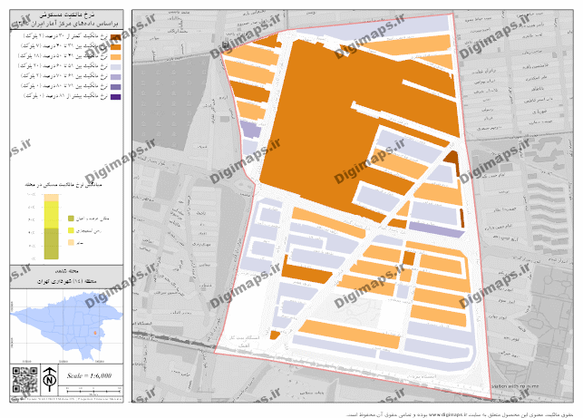 نقشه نرخ مالکیت مسکونی محله شاهد با فرمت PNG با کیفیت تصویر 300 dpi براساس داده های مرکز آمار ایران در سال 1395 تهیه شده است. مبنای محاسبه مقیاس در محصول ارائه شده ابعاد کاغذ چاپی و سیستم مختصات تصویر UTM (zone 39) میباشد.