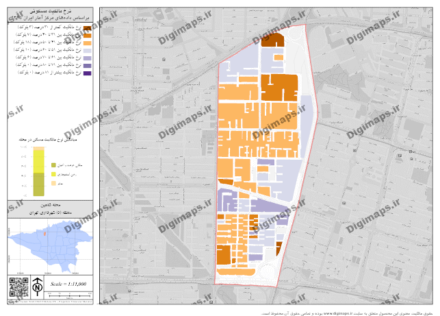 نقشه نرخ مالکیت مسکونی محله شاهین با فرمت PNG با کیفیت تصویر 300 dpi براساس داده های مرکز آمار ایران در سال 1395 تهیه شده است. مبنای محاسبه مقیاس در محصول ارائه شده ابعاد کاغذ چاپی و سیستم مختصات تصویر UTM (zone 39) میباشد.