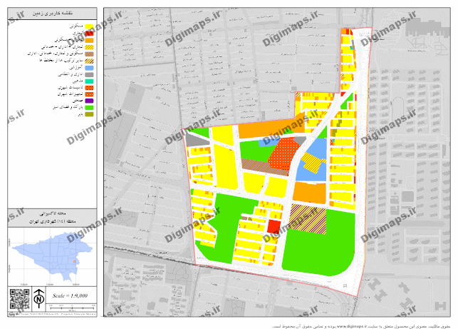 نقشه کاربری زمین وضع اراضی محله تاکسیرانی با فرمت PNG با کیفیت تصویر 300 dpi براساس آخرین دادههای کاربری زمین شهر تهران و براساس سیمبولوژی استاندارد تهیه شده است. مبنای محاسبه مقیاس در محصول ارائه شده ابعاد کاغذ چاپی و سیستم مختصات تصویر UTM (zone 39) میباشد.